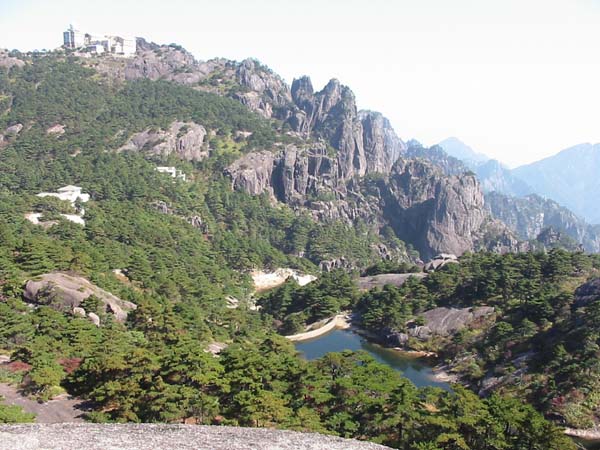 Subimos en un teleférico a primera hora de la mañana. Había bastantes turistas, casi todos chinos. Una vez arriba, había varios senderos, todos ellos escalonados que podíamos seguir, cogimos uno al azar. Hacía un muy buen día, nos sobraba ropa. Los paisajes que vimos hacen honor a la fama que tiene Huang Shan: