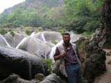 Y finalmente veamos alguna foto de las cataratas. No era época de lluvias, por eso apenas bajaba agua, pero en otras épocas del año, es una cortina continua de agua lo que baja por allá. Sus dimensiones son aprox. 80 por 90 metros. Por el interior de la presa hay un caminito y se puede pasar, de hecho en alguna foto se puede apreciar a alguna persona en su interior: