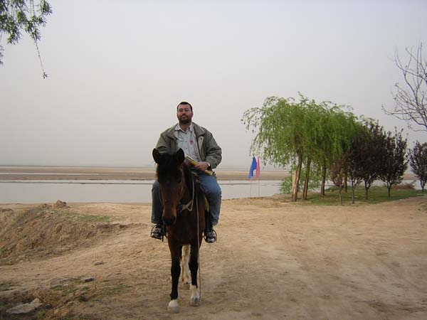 Tras pasar la noche en Dengfeng, a la mañana siguiente tome un bus con destino a Zhengzhou (11 Yuanes), la capital de la provincia de Henan. Allí aunque no era mi intención, tuve que pasar una noche, pues no había billetes de cama blanda hasta Chendu para ese día. De mi estancia en Zhengzhou, lo más destacable, a parte de un restaurante japonés en el que comí de maravilla, es que me acerqué al río Amarillo (HUANG HE en chino), que pasa por allí cerca (a unos 25 kilómetros), y recorrí parte de sus orillas a caballo. Tenía una deuda pendiente con este río, pues lo había atravesado varias veces, pero hasta ese momento no lo había visto (se entiende que lo había atravesado cuando viajaba en tren por la noche).