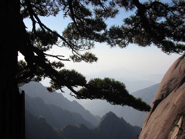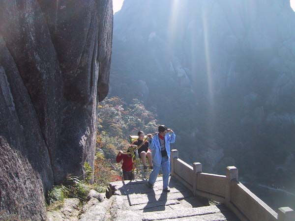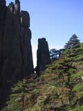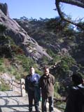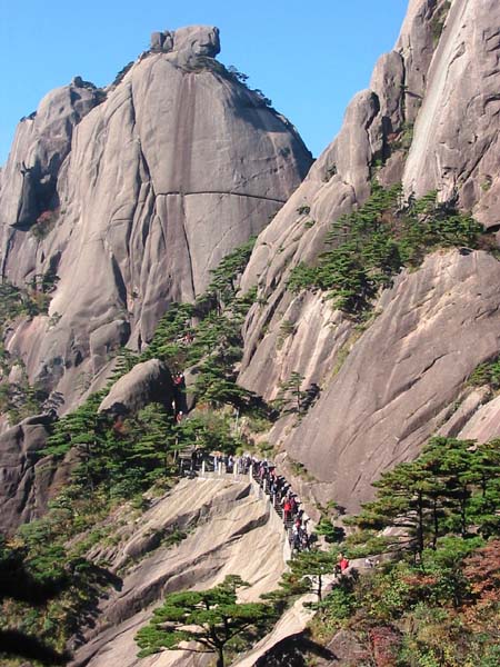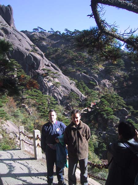 Subimos en un teleférico a primera hora de la mañana. Había bastantes turistas, casi todos chinos. Una vez arriba, había varios senderos, todos ellos escalonados que podíamos seguir, cogimos uno al azar. Hacía un muy buen día, nos sobraba ropa. Los paisajes que vimos hacen honor a la fama que tiene Huang Shan: