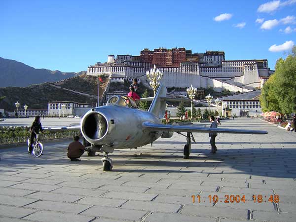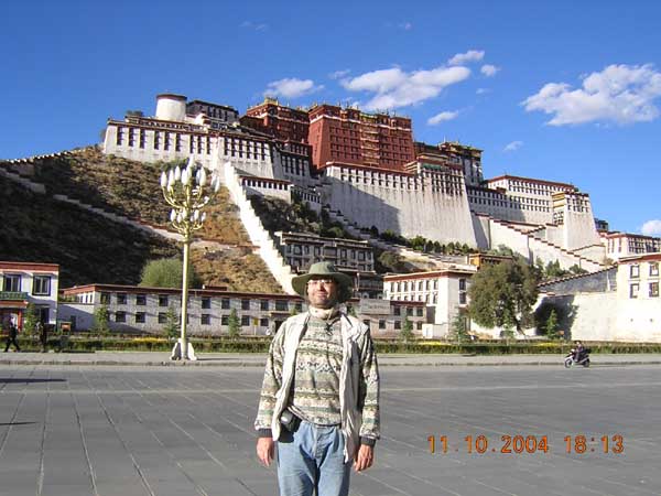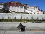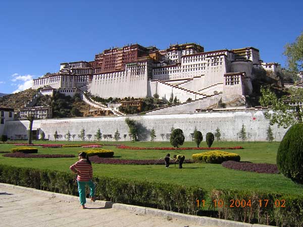 El aeropuerto de Lhasa está a más de 100 Km. de la ciudad, nada más aterrizar cogí rápido mi mochila y un autobús de línea hacia Lhasa. Imaginaba que antes de entrar en la ciudad, podría ver el palacio de Potala desde la lejanía, y no hacía mas que mirar por la ventanilla tratando de descubrirlo, pero lo cierto es que no se ve desde fuera de Lhasa y una vez que se entra en la ciudad, pasaron al menos 20 minutos hasta que el autobús llegó a las inmediaciones del palacio, se me hizo eterno ese tiempo. Había visto el palacio en foto en múltiples ocasiones, pero lo cierto es que me impresionó verlo en directo: