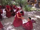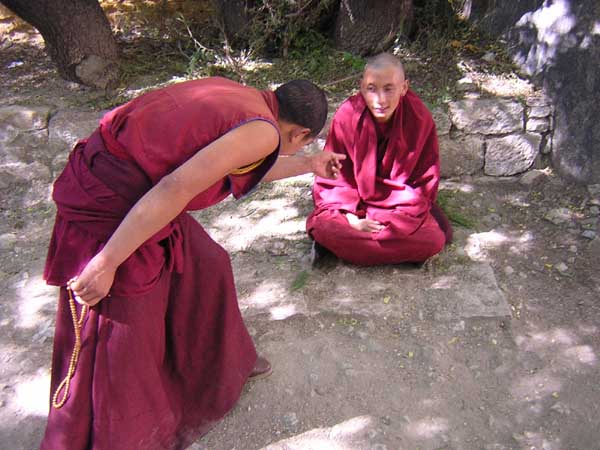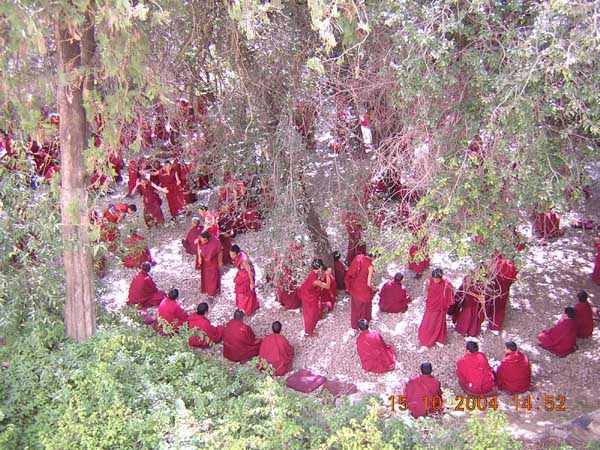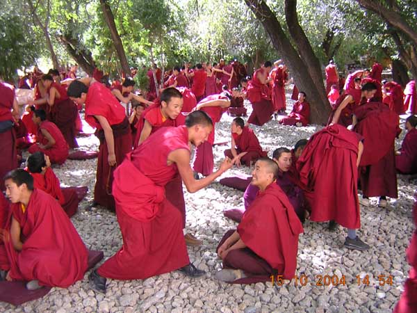 Pero sin duda lo más alucinante de mi visita al Monasterio de Drepung fue el momento del debate entre los monjes. Sobre las tres de la tarde, de repente oigo a lo lejos un rumor intenso de voces, donde antes sólo había silencio, me acerco y esto es lo que había: