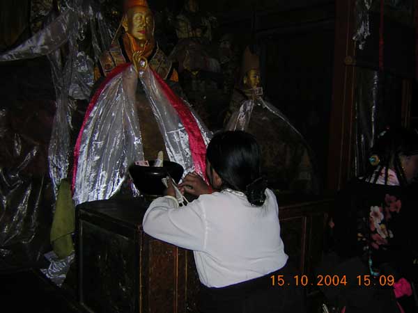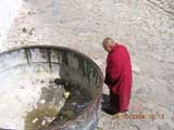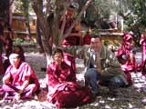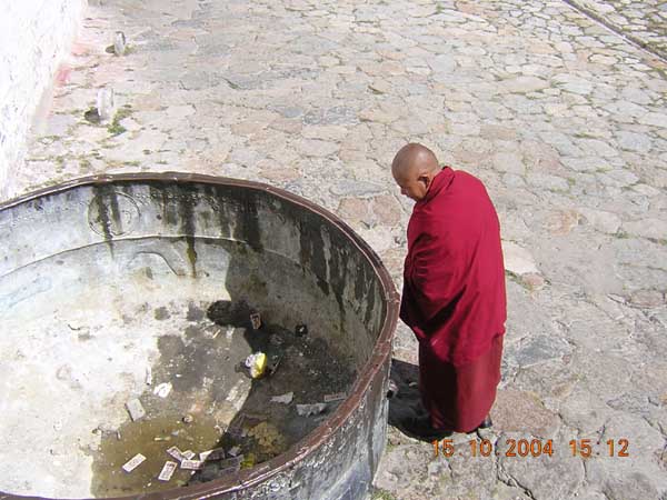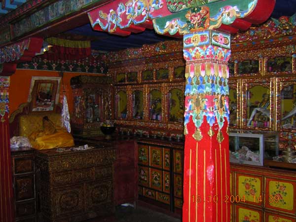 Desde Lhasa fui al monasterio en taxi. El monasterio es en realidad una pequeña ciudad con sus calles y casas. Apenas había turistas, así que en la mayoría de los edificios en los que entré estaba sólo. Por dentro los monasterios están decorados con colores vistosos, y hay figuras un tanto grotestas de deidades y demonios. Las habitaciones de los monjes son sumamente austeras. Por hacer fotos en ciertos lugares había que pagar una cierta cantidad de dinero, al principio seguí esta normal al pie de la letra, hasta que me di cuenta de que no había el menor control sobre esto, y llegó un momento en que creí haber pagado lo suficiente como para hacer fotos en el resto del monasterio por 'la face', y así lo hice. En cualquier caso, la amabilidad de los monjes y el hecho de que siempre estuvieran con la sonrisa en el rostro, a pesar de ser muy dura sus vidas, me impresionó.